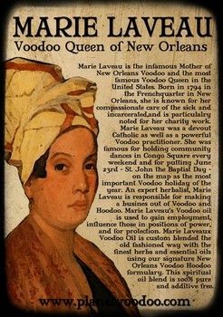 这是个不寻常的女人。她名叫玛芮·拉芙(Marie Laveau)。生于1794年,卒于1881,享年87岁。在她那个年代是长寿的了。她的身上有黑人,印第安人,法国人和西班牙人的血统。是迄今为止,最著名的巫毒教女王。她的名声几乎与新奥尔良一样色彩斑斓,新奥尔良也因她而更有魅力。她是这个城里最受注目的传奇人物,一个永远的谜。她出生于新奥尔良一个富裕的家庭(但也有人说她是在1809圣多明各奴隶起义之后来新奥尔良的)。她父亲名叫Charles Laveau,一个有钱的,看上去几乎像个白人的有色人庄园主。她的母亲Darcantel Marguerite是一个女奴。玛芮是他们的私生女。现在关于她唯一可证实的档案是她在1819年8月与Jacques Paris结婚的教堂纪录。她与帕里斯结婚不久,帕里斯就神秘失踪了。有人推测可能是帕里斯抛弃了她。不久一个叫Louis Glapion的军官就住进了她小屋的阁楼。她后来以帕里斯的寡妇自称。