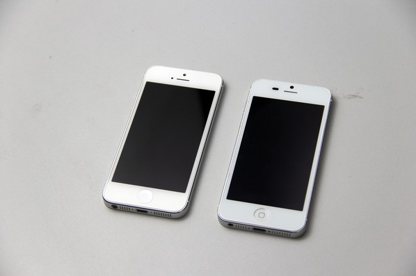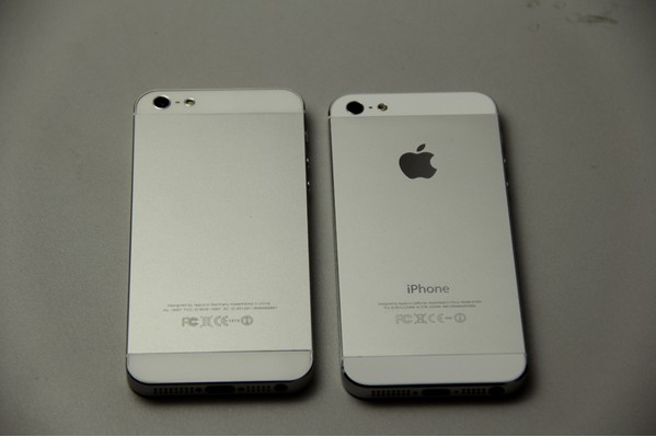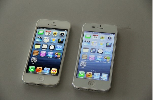 看到这里,也许你会说,这山寨公司也太不专业了吧!乐果i5手机公司一定会马上反驳你说:“我们专注的是手机本身的相似度和完美的体验,因为像手机包装盒和相关配件这类无关紧要的物品,用户一般都会放在抽屉里,别人看不到”。既然如此,我们来看看手机主体本身。同时为了公平公正,我们还专门拿了一台苹果iPhone 5来跟乐果i5做对比。单纯看上面的图片,你知道哪台是iPhone 5,哪台是i5,你分辨得出来吗?