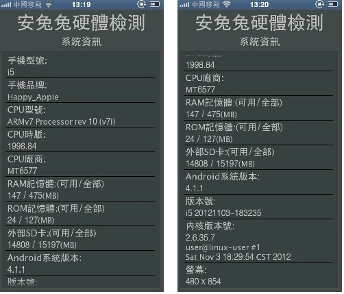 官方已经说明是android4.1系统、分辨率为854*480、双核1GHz A9 CPU、512M RAM和16G ROM、前置130万像素,后置800万像素,支持自动对焦、有蓝牙3.0有WiFi、感应器、重力传感器、距离传感器、光线传感器、三轴陀螺仪、磁传感、导航GPS,应有尽有!我用安兔兔硬件检测居然能够识别出来,是不是说明了有一点点知名度啊?