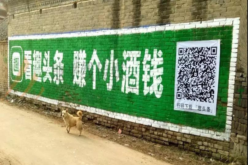 不止是资金投入,为了吸引下沉市场用户,趣头条的营销攻势也是玩法多多,例如用“看趣头条,赚个小酒钱”这类土味广告词“刷墙”农村的街头巷尾。