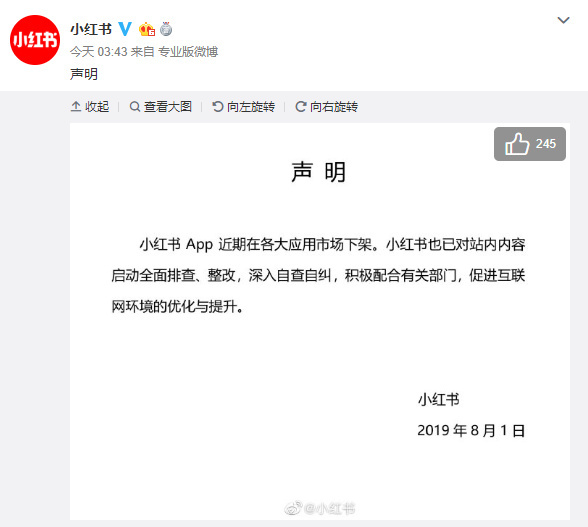 今日凌晨,小红书官方正式就“下架”一事作出回应。小红书表示,已对站内内容启动全面排查、整改,深入自查自纠,积极配合有关部门,促进互联网环境的优化与提升。