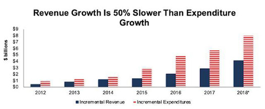 啥意思?你饿的时候,第一个馒头是最香的(效用最大),此后第二个、第三个效用逐渐递减,当我喂你第10个馒头的时候你已经饱了(效用为零),当我喂你第1000个馒头的时候你就要吐了(效用为负)。所以,网飞在初期,大手笔砸内容搞营收是可以的,可是一旦过了用户的原始积累期,每花一分钱所对应的用户增长都在放缓——边际效益递减,内容投入的性价比越来越低。但网飞近年来的内容支出只增不减,成本越来越难压下来。