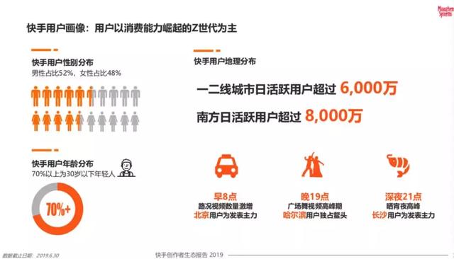在用户层面,在快手过2亿的日活用户中,一二线用户超过6000万,南方用户超过8000万,每天早8点北京用户会涌上来疯狂吐槽路况,而晚间则是哈尔滨用户的广场舞创作高峰。