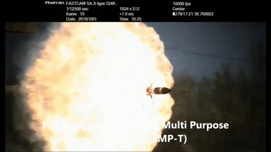 美军在购买使用DM11后觉得不错,以DM11为基础开发了AMP(Advanced Multi Purpose)项目,该动图为AMP项目中XM1147 HE-MP射击过程,XM1147与DM11均使用前张式尾翼稳定,弹体微旋。XM1147为传统流线型弹体。编程引信可以让弹丸在接近目标的空中引爆,以发挥钨球破片预制衬层最大的杀伤性能,注意看弹丸空中引爆后钨球击中地面扬起的尘土。