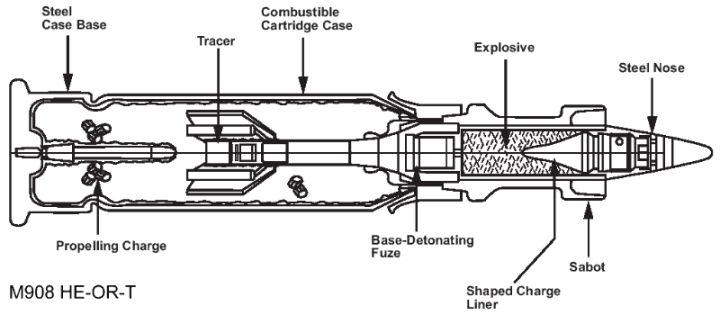 M830A1确实挺好用的,飞行速度快,引信模式多,对空、对地、对人员都好用,但就是太贵了,尤其是近炸引信,成本较高,而且通过实战发现,空中目标占所有目标的比例还是很小的,所以新弹去掉了近炸引信并小幅改进,以增强对地面目标的杀伤能力,这就是M908 HE-OR (High-Explosive Obstacle Reduction),高爆破障弹,但是从弹体结构上来说与M830A1 HEAT-MP 基本是一样的。