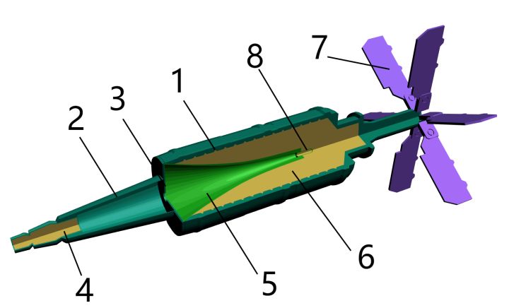坦克炮进入滑膛炮时代后,不再需要抗旋部件,仅使用尾翼稳定,值得一提的时,即使是使用滑膛炮射击的尾翼稳定弹丸,翼片的一面对弹轴成2°-6°倾角,使弹丸在飞行中做低速旋转,对弹丸的精度有利。图为苏联125mm破甲弹典型结构图。图中:1-弹体、2-长杆头螺、3-连接螺圈、4-引信、5-药型罩、6-装药、7-尾翼、8-起爆装置。