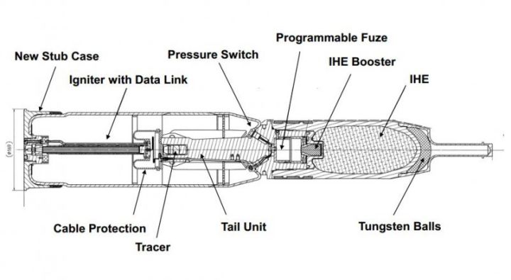 并不是所有带长杆的弹都是HEAT,比如德国DM11 HE-MP(High-Explosive Multi-purpose),就是头部带有长杆的多用途榴弹,这个弹非常有意思,头部有钨球破片预制衬层(Tungsten Balls),弹丸内部主要是钝感炸药( IHE,Insensitive High Explosive ),最有意思的是这个弹有一个可编程的引信(Programmable Fuze) 和带有数据链的传火管(Igniter with Data Link), 这意味着该弹可以根据发射时写入的预制程序进行引爆。