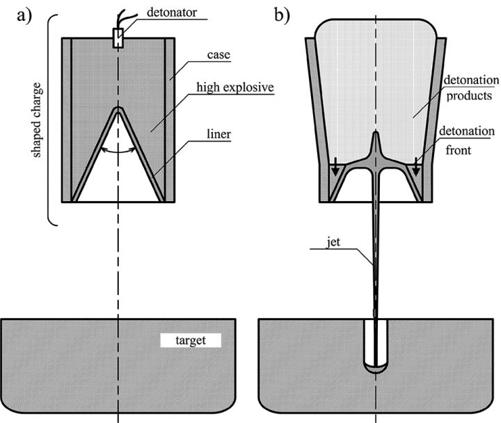 1、药型罩,药型罩式形成射流的主要零件,其结构和质量好坏直接影响射流的优劣,从而影响破甲威力。药型罩的造型有喇叭形、锥形、半球形,从破甲效果来看喇叭形最佳,半球形最差,但实际应用种最常见的是锥形,稳定性好且生产工艺简单。常用的药型罩材料是紫铜,铜的密度大,并且有一定强度,超动载下塑性较好,但价格相对昂贵。