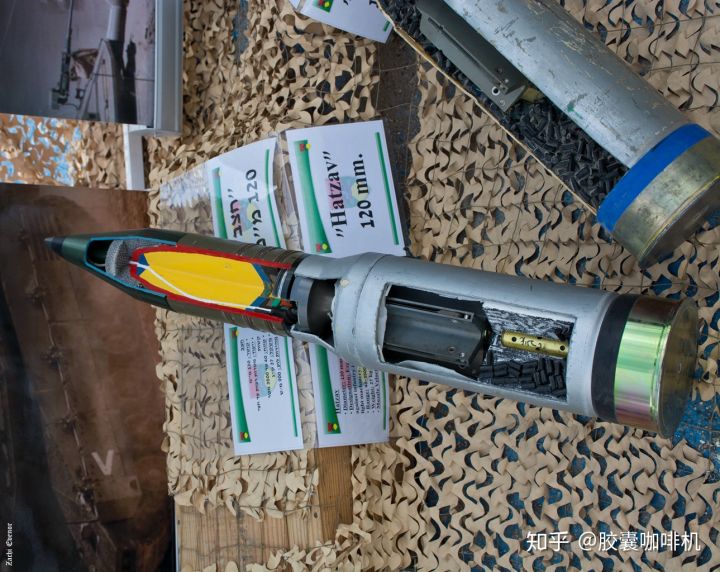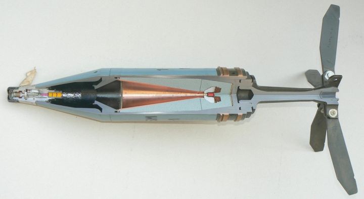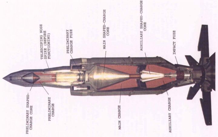德国12cm DM12 HEAT-MP,也称之为MPAT(Multi-purpose anti-tank),同口径固定尾翼稳定,压电式引信,壳体/导线回路。长杆头螺细长,长是为了定炸高,细是为了改善大着角下引信触发性能。