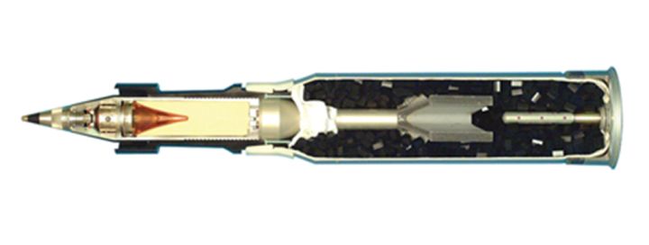 M830A1主要的作战目标是轻型装甲目标、直升机、工事,同时杀伤人员。鉴于轻装甲目标和直升机的高机动性,M830A1采用次口径脱壳弹结构,炮口初速从1140m/s提高到1400m/s。由于弹丸直径的下降,破甲威力有所降低,但弹体四周有预制破片,杀伤能力大大提高。M830A1另外一个特点就是在弹丸头部安装了一个复合引信,包含触发/延时/近炸三种模式。对付重装甲目标时使用触发模式,提高破甲深度;对付轻装甲目标时使用延时模式,利用动能击穿后在内部爆炸;对付空中目标时使用近炸模式,靠近目标时引爆弹药。图中:引信(红色)、药型罩(浅黄色)、炸药(橘黄色)、起爆雷管(紫色)。