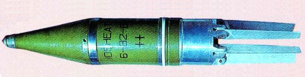 苏联100mm BK-5M HEAT,采用活动弹带环结构,使弹体产生低速旋转,同时保证膛内闭气性良好,弹体依靠尾翼稳定,尾翼为前张式,靠离心力惯性力张开,引信为机械引信,头部触发,轰爆波通过中心管使弹底的雷管起爆,从而使弹丸爆炸,机械式传火起爆引信简单可靠,但作用时间较长。