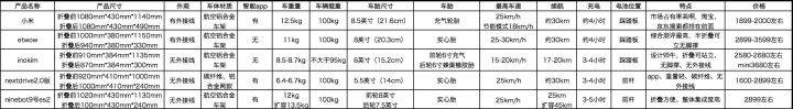 下面是我总结的一个表格,是当前几款热销的滑板电动车技术数据。