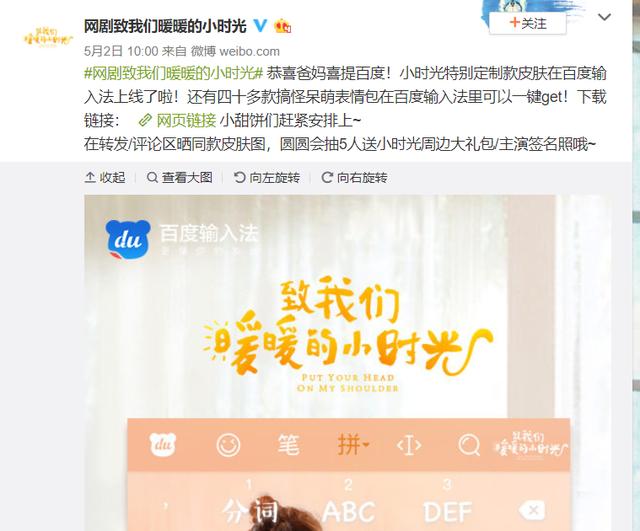 追剧皮肤,则供粉丝分享影视剧的爱豆一个美好的瞬间,让人时刻感受到爱豆们的身影。百度输入法联合了网剧致我们暖暖的小时光推出追剧皮肤,同时上线了四十多款搞怪呆萌表情包,体验都很不错唷。