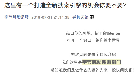 7 月 31 日晚,字节跳动在其 " 字节跳动招聘 " 公众号上正式对外为 " 字节跳动搜索部门 " 招聘员工。