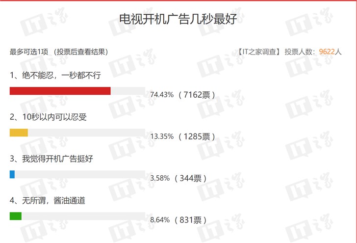 IT之家也开启了智能电视的广告喜好调查,到目前为止,有9622人参与投票,有74.43%的网友表示一秒都不行,有13.35%的网友认为10s内广告可以忍受,有3.58%的网友认为有开机广告挺好。
