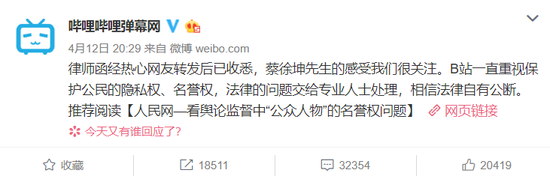4月12日下午,@蔡徐坤工作室 发出律师函,称B站上存在大量严重侵犯蔡徐坤权利的内容,而且点击量高、传播范围广,影响十分恶劣。