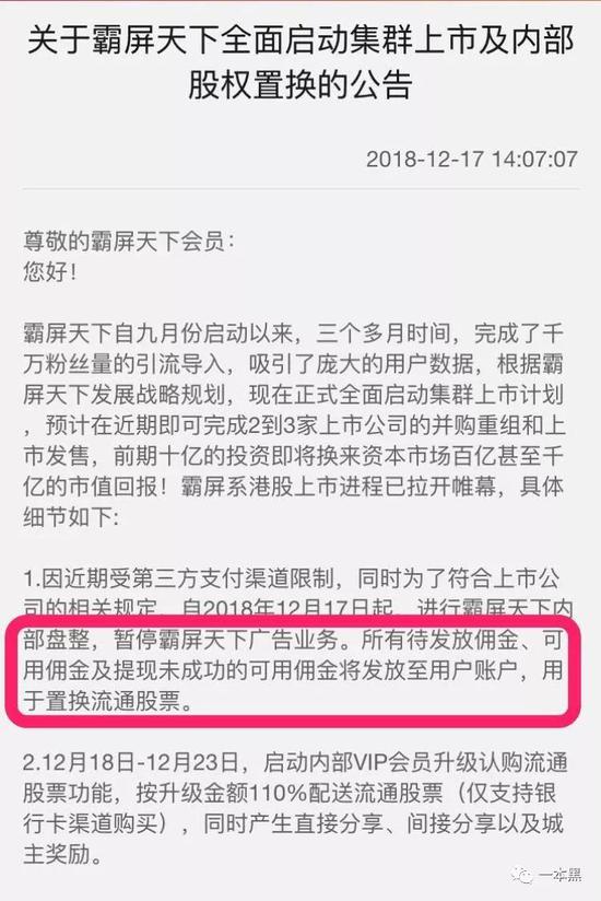 霸屏天下已经运营三个月,近日频繁在App中发布公告,更名、上市、股票,每个字眼都让会员颤抖。