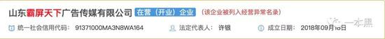 2、霸屏天下背后的企业,为新注册企业,却因“通过登记的住所或经营场所无法与企业取得联系”,而被列入经营异常名录。