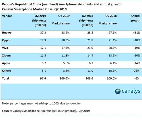 日前,市场分析机构Canalys公布了2019年第二季度国内手机市场的分析报告,其中华为出货量达到了3730万台,市场份额占到了38%,遥遥领先其他手机品牌。