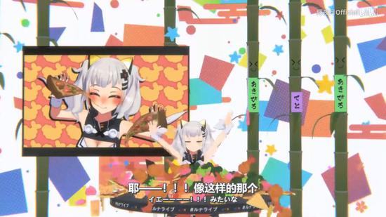 例外,VTuber和观众的互动形式也更加丰富。收看直播的观众在NICONICO生放送上的留言或者Twitter上的评论,会以对话框或3D字体物件的形式出现在虚拟直播间。利用这些字体物件,VTuber可以和观众一起玩接球游戏和呼叫应答游戏。这大概是升级为3D立体版的弹幕了吧。
