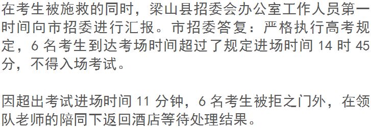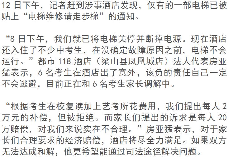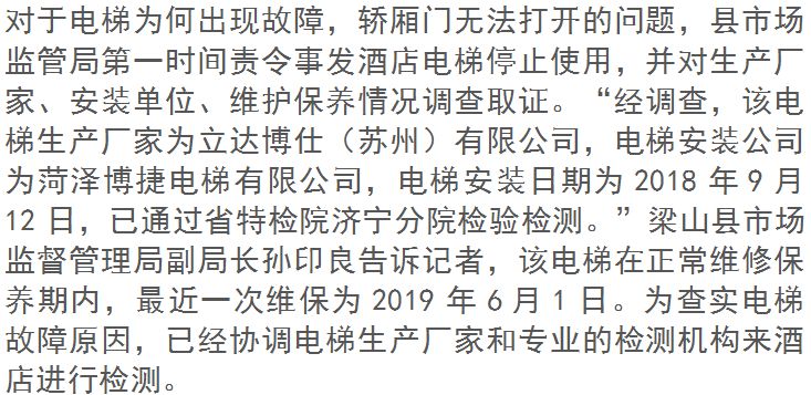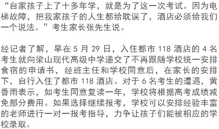 考生小于告诉记者,由于家住得比较远,6月6日,他们在距考点800米左右的都市118酒店(梁山县凤凰城店)入住,可没想到,在最后一门英语开考前,却遇到了电梯故障。“8日下午,因英语考试需提前15分钟进场,我们在14时15分就乘酒店电梯下楼,但直到14时55分我们才从电梯里出来。因为在此期间,电梯到一楼后没有开门。”小于说,当时电梯内除了他们6名考生,还有一位美团的外卖员。