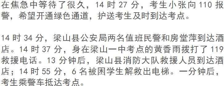 “14时20分左右,梁山现代高级中学高三六班班主任房堂萍在班级QQ群里看到考生小张上传的视频,说是6名考生被困电梯,情况紧急,我就让房堂萍与两名民警一起赶往涉事酒店。”梁山现代高级中学副校长黄香雨介绍,入住酒店的共有4名考生,余下两名考生是从家出发,在酒店集合一起参加英语考试。