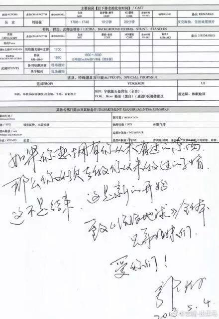郭帆在通告单空白处写了几行字: