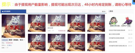 网站下方写着一行红字:“由于提现用户数量增加,提现可能出现次日达,48小时内肯定到账,请耐心等待”,看来平台的黑客很多,单子也很多。