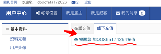 在充值页面,我发现该网站唯一支持的充值方式居然是直接加客服QQ打钱: