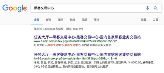 幺哥搜关键词 “黑客交易中心”后 ,发现果不其然,一个号称“国内首家黑客交易站点”的网站排在百度搜索结果第一位。