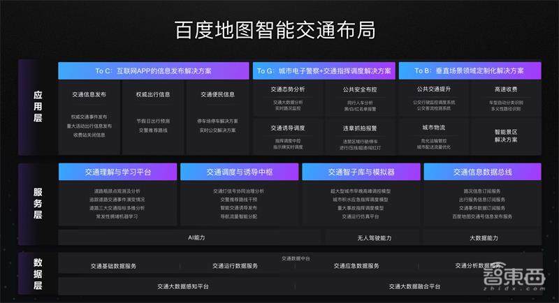 基于强大的数据生产能力,百度地图从2016年就开始进行涉及智能交通与智能城市建设相关的业务。目前,百度地图已经形成了集交通大数据感知和融合能力为一体的交通数据中台,在此基础上以百度人工智能、无人驾驶、大数据为核心能力,提供算法模型、数据订阅、研判学习、指挥调度四大服务,最终形成了三大类应用方案,包括服务用户的权威信息发布解决方案,为政府部门提供城市交通管理指挥调度解决方案,以及面向合作伙伴的公交、高速、物流、景区等更加垂直的解决方案。