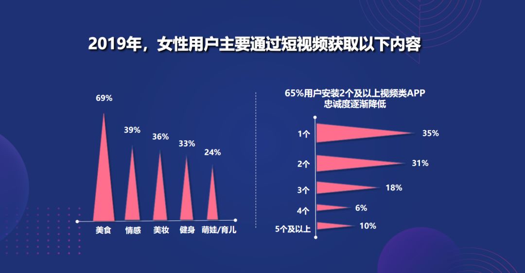 富媒体需求。她们在消费以及获取信息的内容载体上也发生了很大的变化,富媒体化现象越来越明显,除了传统的图文形式,短视频、直播、综艺IP、Vlog、音频等各种形式逐渐兴起。其中从2019年的全网数据可以看到,在最热的短视频形式中,关于萌娃育儿的内容已经上升到TOP5位,另外还有65%的用户安装了2个及以上的视频类APP,APP用户忠诚度越来越低。因此无论做品牌投放还是用户黏性,都要从不同角度考虑用户消费行为和他的变化。