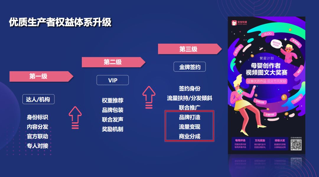 在内容生态行业中同样也存在着“马太效应”。优质内容在享有全部用户眼球的同时更获得平台扶持,塔尖生产者永远获益,导致内容生态失衡,两级分化严重,强者恒强,弱者愈弱。宝宝知道也在不断深耕和迭代优质生产者的权益体系,确保每个层级的内容生产者都能通过百度母婴获取相匹配的平台势能,同时通过平台扶持更好的成长。