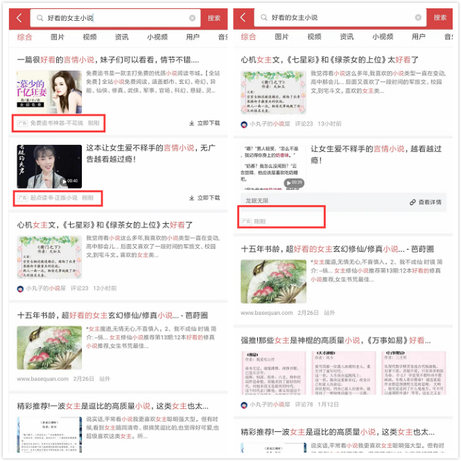 与此同时,当记者前后2次搜索关键词“好看的女主小说”后,出现的广告结果并不一样,但位置都较靠前。