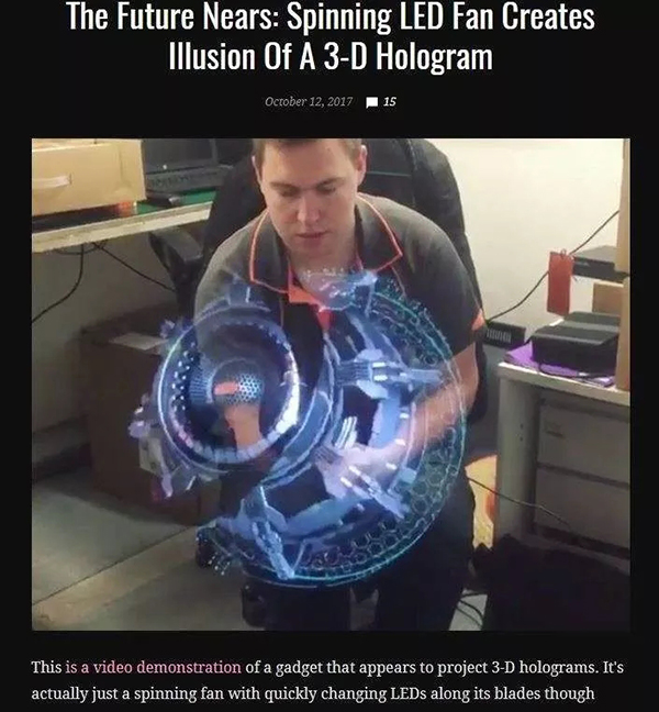 扬子晚报10月19日报道,近日,外国网友在社交媒体上发文称,他们在此前的中国之行中带回了一样非常酷的物件,它像电风扇一样,在叶片转动的同时能够展示出一幅幅3D影像。紫牛新闻记者采访发现,这个炫酷的高科技产品是毕业于南京东南大学的90后小伙和他年轻的团队创造出来的!