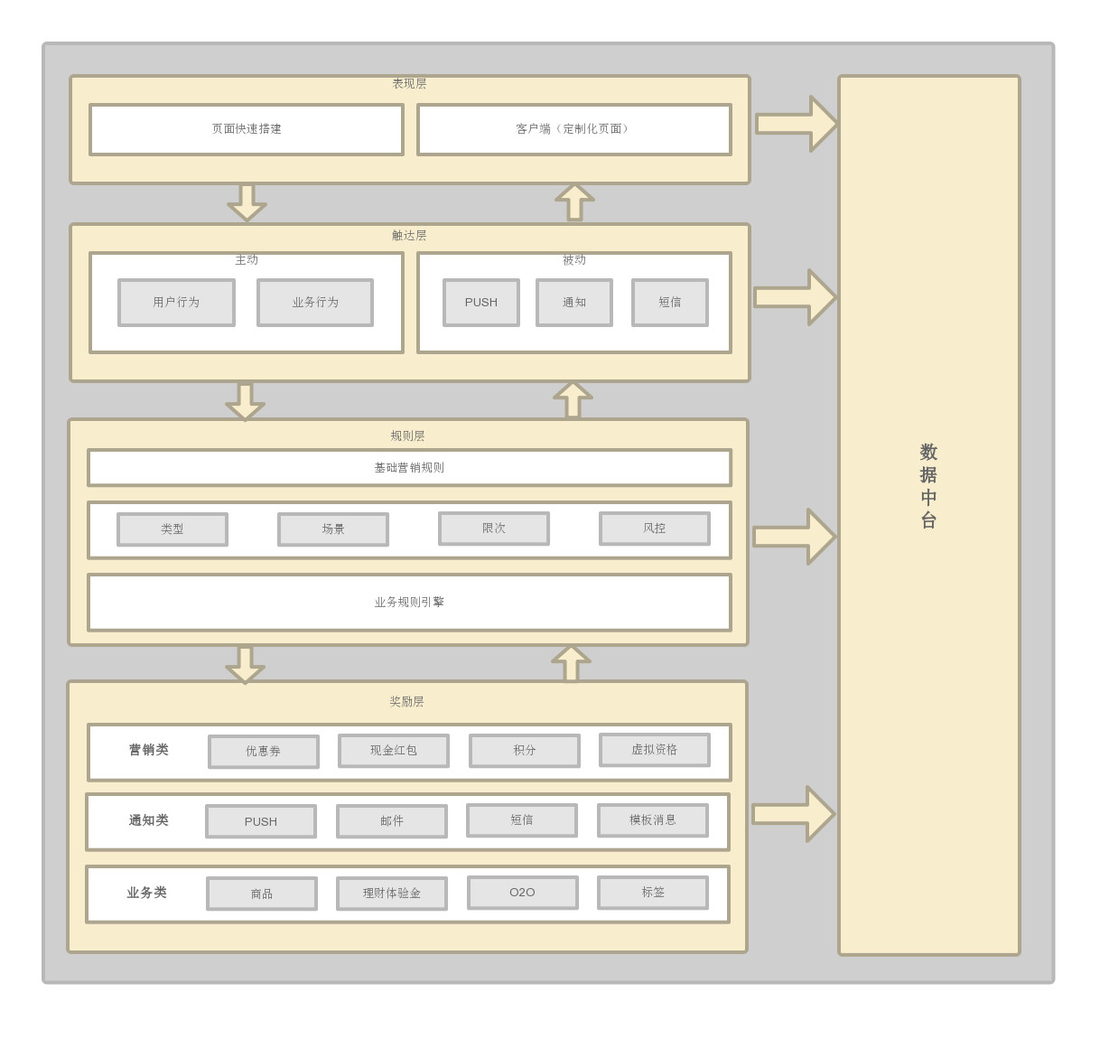 本文以狭义营销中台为讨论核心,从全局角度分析了营销中台产品模型中的表现层、触达层、规则层、奖励层。