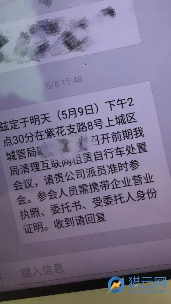 图为上城区城管委某工作人员发给各家单车公司的短信。