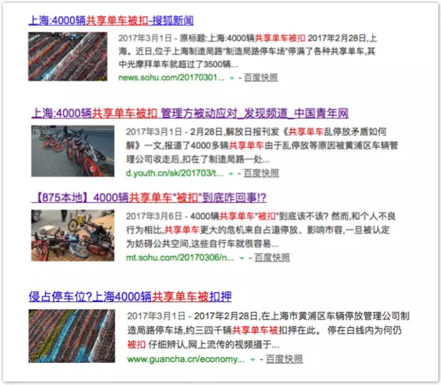 另外,在各家媒体的跟进报道中,我们了解到今年3月中旬以来,针对互联网商业单车随意投放、无序停放的街面乱象问题,城管执法部门重点对景区、车站、广场等人流集中、问题突出区域,严重影响行人通行安全、侵占盲道、破坏绿化等突出行为,加强日常街面执法管控和节假日的保障工作。