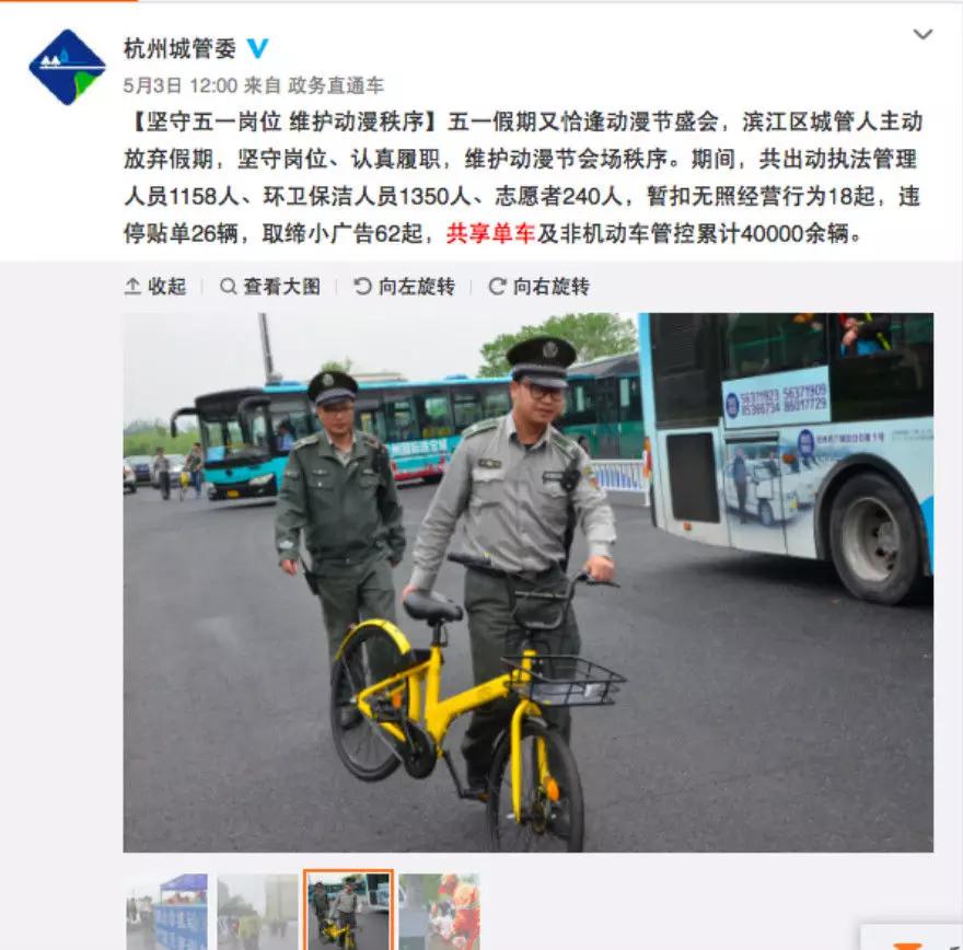 在可查到的内容中,今年5月3号杭州城管委发布了第一条对共享单车违停拖移的处理。