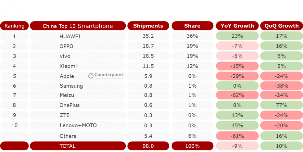8月3日消息,市场调研机构Counterpoint今天送出了2019年第二季度中国智能手机的分析报告,整体出货量上与去年同期相比,下滑了9%,不过下滑势头有所放缓,而排名前十的厂商市场份额加起来达到了92%。