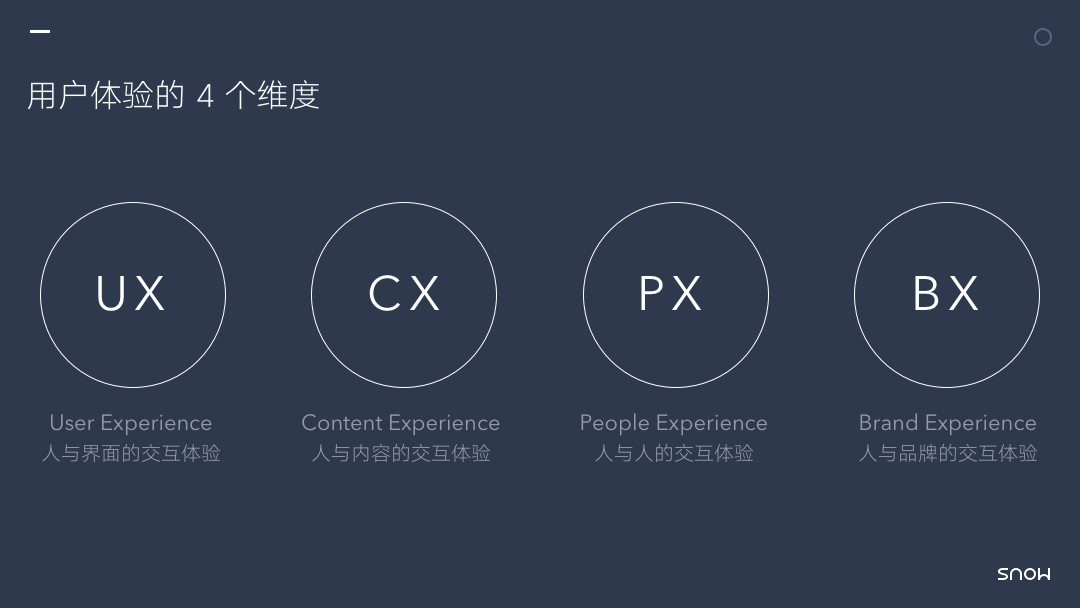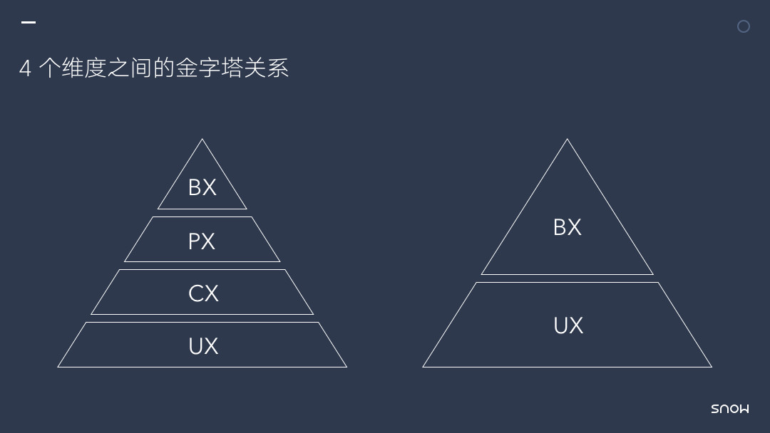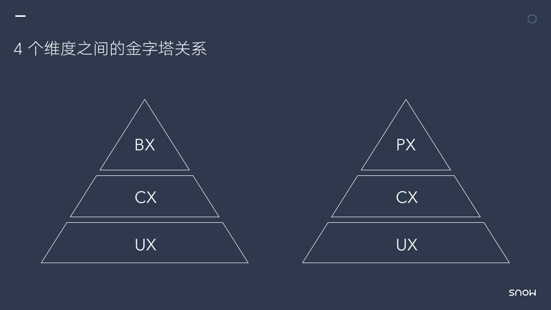 如果把用户体验的 4 个维度比作一个金字塔的话,塔底的一定是 UX,再往上分别是 CX 和 PX,BX 在最上面。