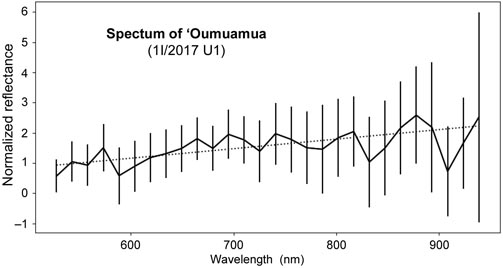 Oumuamua光谱(2017年10月25日,竖线表示每一个测量波长的误差范围,虚线表示红色和近红外波长的总体趋势)