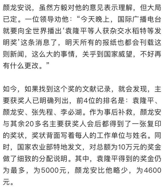 “但现在人们都不知道当年大协作这个事了,以为这是袁隆平一个人的功劳”,娄希祉指出,这既是媒体舆论的一个误区,也是客观因素造成的。他解释说,1987年,中国将杂交水稻这个成果向联合国教科文组织申报科学奖。本来是以中国农科院和湖南农科院为主体来申报,但根据国外的评奖规则,报奖人不能是一个单位,必须要具体到个人。袁隆平是这一领域被公认的开拓者,又是1981年特等奖的第一获奖人,于是,顺理成章地,这次大奖就再次落到了他的头上。