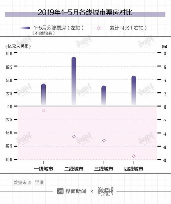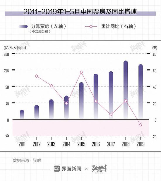 据猫眼数据,2019年1-5月中国电影分账票房(不含服务费)和观影人次的同比增速均为负,出现2011年来首次下降。