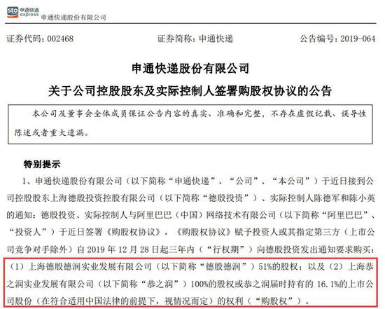 这意味着,阿里巴巴未来或继续收购申通快递股份,如全部行权可能导致申通快递的实控人发生变更,申通也将成为第一家被阿里控股的快递企业。