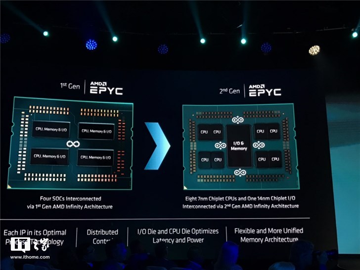 AMD 7nm EPYC 7002系列处理器采用7nm CPU die + 14nm I/O die,每8个CPU die连接一个I/O die,8通道内存,128条PCIe通道。
