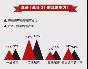 在对《战狼2》的票房统计中显示,一线城市贡献了19%的票房,二线城市占比41%,三四线及以下城市占据了40%的份额。