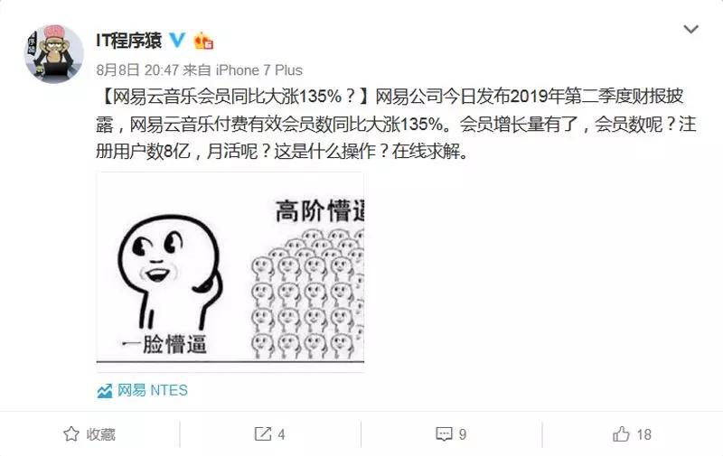 IT程序猿的官方微博也说,网易云音乐付费有效会员数同比大涨135%。会员增长量有了,会员数呢?注册用户数8亿,月活呢?这是什么操作?在线求解。