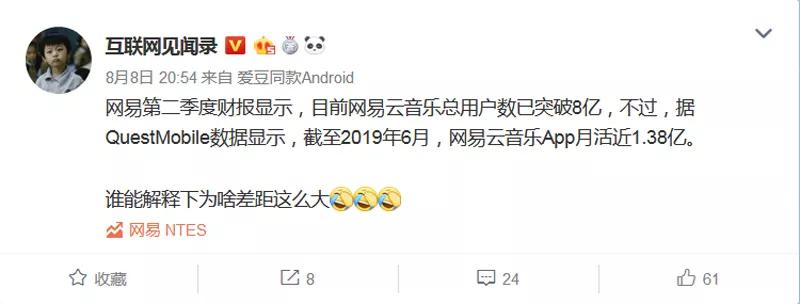 网易在公布其二季度财报时,高调宣布网易云音乐注册用户已经突破8亿。看上去这是一个绝对的利好消息,但在社交媒体上却出现质疑声音。