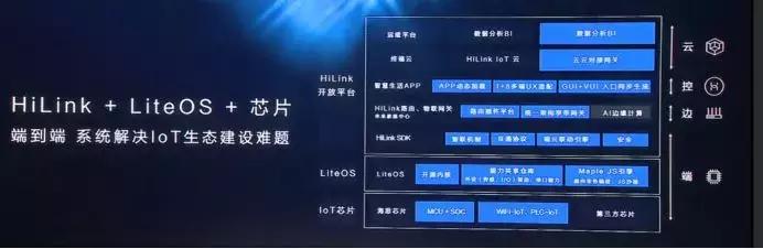 在端侧,无论是智能台灯还是智能风扇,大约有三个东西需要部署,分别是芯片,操作系统(LiteOS),以及相应的软件开发工具包(HiLink SDK)。